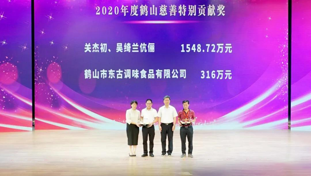 在慈(ci)善頒獎儀式(shi)上、市(shi)(shi)領導向鶴山市(shi)(shi)東古調味食品(pin)有限公司頒發了2020年度(du)“鶴山慈(ci)善特別貢獻獎”。