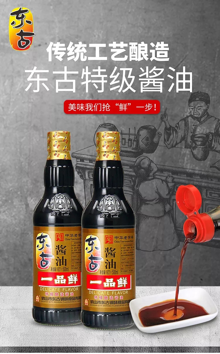 核心(xin)產品“東古(gu)一品鮮”,以天然山(shan)泉(quan)水(shui)為(wei)水(shui)源(yuan),采用結實(shi)飽滿非轉基因大豆、優質小麥粉,秉承(cheng)傳統小池曬制工(gong)藝,深層發(fa)酵,抽取第一(yi)道原油匠心釀造(zao)而成(cheng),因而“東(dong)古一(yi)品鮮(xian)”醬香濃郁、色(se)澤紅亮、鮮(xian)味(wei)十足,備受廣大消費者青(qing)睞(lai)!