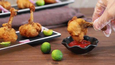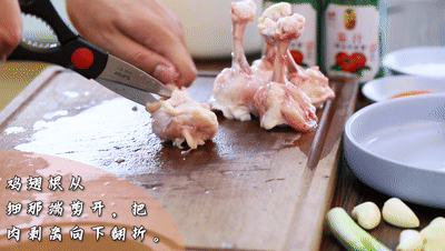 雞翅根(gen)從(cong)細的那(nei)端剪開、把肉和骨頭剝離向下(xia)翻折(zhe)。弄好后放碗里