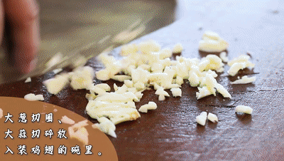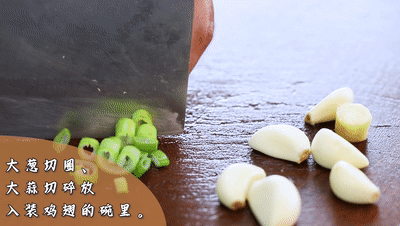 把(ba)大蔥(cong)切(qie)圈、大蒜(suan)切(qie)碎放入裝雞翅的碗里
