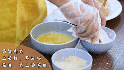 腌制好(hao)的雞翅先裹(guo)上一層面粉,再沾上雞蛋液,再裹(guo)上面包糠(kang)