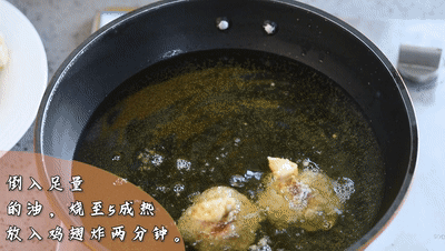 鍋里倒入足量的(de)油,燒至5成熱(re),放入雞翅炸(zha)(zha)兩(liang)分(fen)鐘、炸(zha)(zha)至定型(xing)撈(lao)出(chu)。再轉中大火翻炸(zha)(zha)一次即可