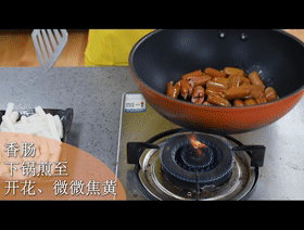 香腸(chang)下鍋(guo)煎至開花、微(wei)微(wei)焦黃(huang),下年糕一(yi)起翻炒(chao)。