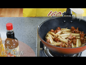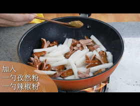 鍋(guo)中加入一勺(shao)生(sheng)抽、一勺(shao)孜(zi)然粉(fen)、一勺(shao)辣椒(jiao)粉(fen)、一小勺(shao)白(bai)糖、半勺(shao)鹽