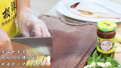 蒜苗和香菜(cai)切段、處理好的鱸(lu)魚剁成小(xiao)塊,放碟子里備用
