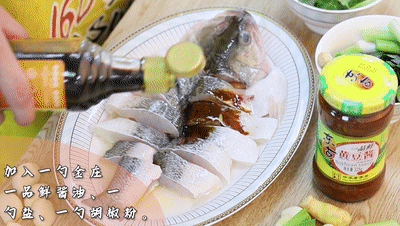 往魚上(shang)加入一(yi)勺(shao)(shao)(shao)東古金(jin)莊一(yi)品(pin)鮮醬油、一(yi)勺(shao)(shao)(shao)鹽、一(yi)勺(shao)(shao)(shao)胡椒粉(fen)、一(yi)勺(shao)(shao)(shao)一(yi)品(pin)鮮黃豆醬、一(yi)勺(shao)(shao)(shao)面粉(fen)撈(lao)拌均勻,腌制兩分鐘
