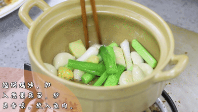 起鍋燒油,加(jia)入蔥(cong)姜蒜苗,炒出香味。放入魚肉,把剛剛腌制的料(liao)汁也加(jia)進去,再加(jia)半碗水。