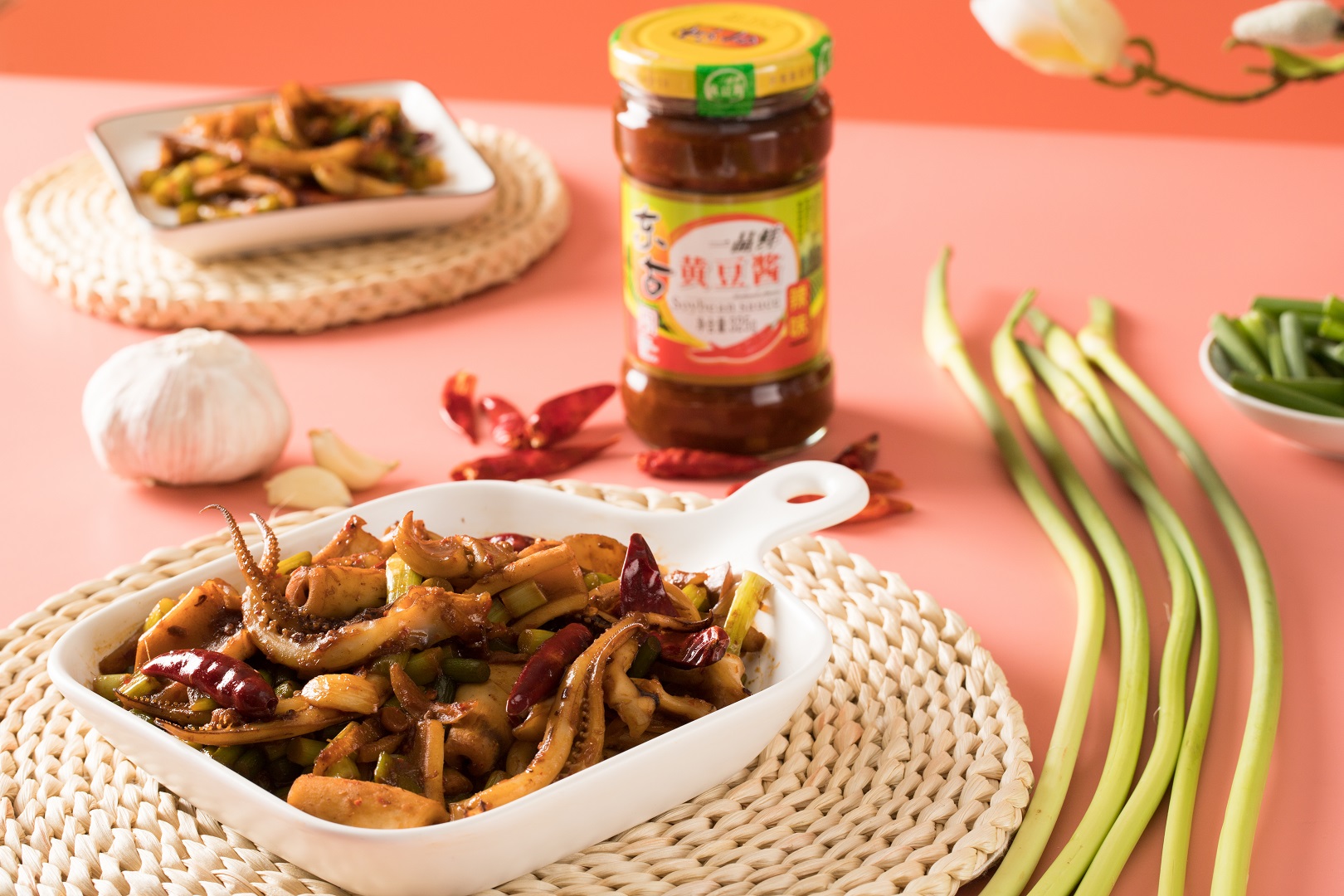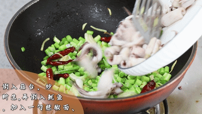 再倒(dao)入魷魚(yu),加入一(yi)勺辣椒面、一(yi)勺一(yi)品(pin)鮮醬(jiang)油、一(yi)勺東古蠔油、一(yi)勺黃(huang)豆(dou)醬(jiang),翻炒(chao)均勻即可