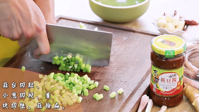 蒜臺切(qie)粒,小蔥切(qie)段,姜塊(kuai)切(qie)絲。然后把(ba)魷(you)魚處理好,切(qie)成中小塊(kuai)