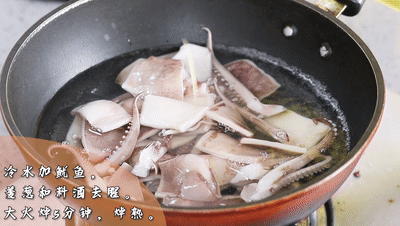 鍋(guo)里放水(shui),冷水(shui)加入魷魚,姜蔥和料酒去腥。大火(huo)焯(zhuo)5分鐘,把魷魚焯(zhuo)熟