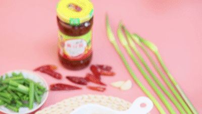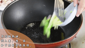 另起鍋熱油(you),倒入姜、蔥、蒜和干辣(la)椒(jiao)炒(chao)出(chu)香味。再倒入蒜臺,炒(chao)斷生