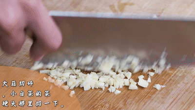 大蒜切(qie)碎,小白菜的菜梗頭那里切(qie)一下(xia)