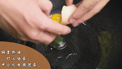 鍋(guo)里熱油,打入(ru)雞(ji)蛋,中小火煎荷(he)包(bao)蛋
