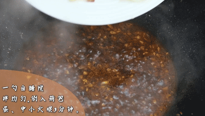 倒入荷包蛋、中小火煨三分鐘(zhong),最(zui)后澆上一(yi)勺(shao)花椒(jiao)油