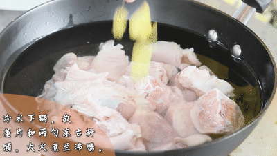 豬(zhu)蹄冷(leng)水下鍋,放(fang)入(ru)姜片和兩勺東古料(liao)酒,大(da)火(huo)煮至沸騰(teng),再煮20分鐘,撈出放(fang)入(ru)冰水中備用(yong),煮完豬(zhu)蹄的(de)高湯別倒(dao)一(yi)會有用(yong)。
