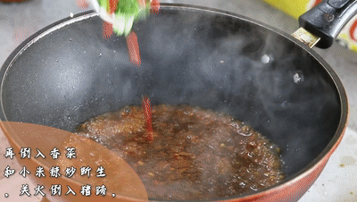倒(dao)入香菜和小米辣炒斷生(sheng),關火倒(dao)入豬(zhu)蹄,攪拌(ban)均勻讓每(mei)塊豬(zhu)蹄都(dou)蘸上(shang)料汁即可