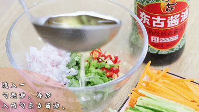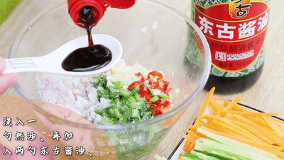 豆泡放入(ru)盤里(li),加入(ru)香菜、木耳絲(si)、青瓜絲(si)、胡蘿卜絲(si),再(zai)把調好(hao)的料汁倒進(jin)去撈(lao)拌均(jun)勻即可。