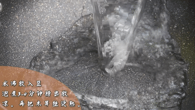 鍋里燒水,水沸放入豆泡煮3-4分鐘撈(lao)出放涼。再把木耳絲燙熟。