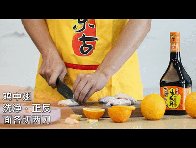 12個(ge)雞翅中洗(xi)凈,正反兩面(mian)各切(qie)兩刀加姜蒜片(pian)。姜、蒜、橙子切(qie)片(pian)備用。