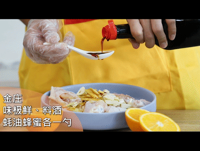 一(yi)勺(shao)料酒(jiu)、3 勺(shao)生抽(chou)、一(yi)勺(shao)老抽(chou)、一(yi)勺(shao)蠔油(you)、一(yi)勺(shao)蜂蜜、少許黑胡椒和鹽(yan),半個橙子(zi)的橙汁,戴手套(tao)抓拌均勻后(hou),腌制兩小時。