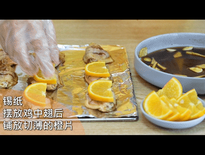 烤盤鋪(pu)上(shang)錫紙,雞翅中擺好(hao)位置,再(zai)依次放切薄的(de)橙子片,烤箱預熱后,200℃ 先烤 10 分鐘。