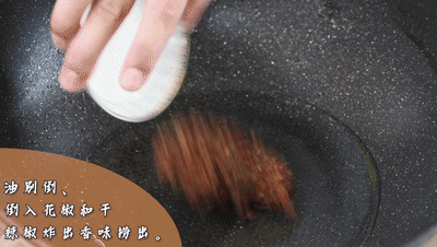 再倒入蒜粒和(he)蔥段爆香(xiang)、加入兩(liang)勺半(ban)東古(gu)香(xiang)格辣(la)炒(chao)出(chu)紅油。