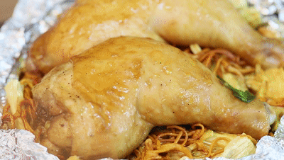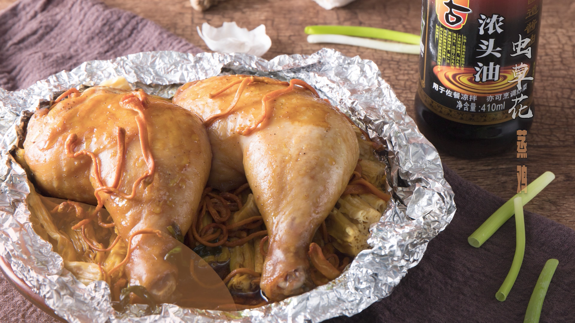 準備一張大錫紙,腐竹蟲草花兜(dou)底,雞(ji)腿放上(shang)面,把腌制剩余(yu)的料汁也(ye)倒(dao)進去,錫紙包裹好