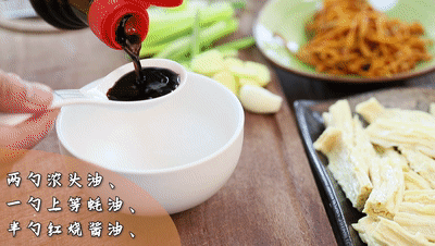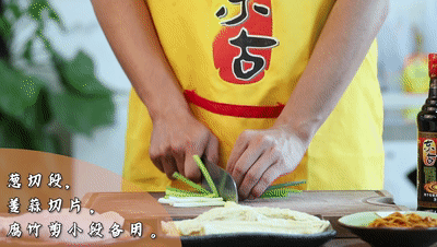 蔥切段,姜蒜切片,腐竹(zhu)煎小(xiao)段備(bei)用