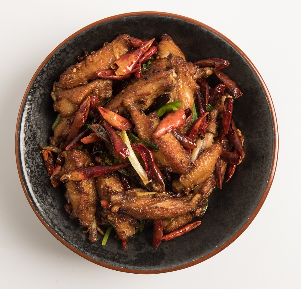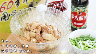 雞(ji)中(zhong)翅、小蔥、姜、干辣椒(jiao)、花椒(jiao)、面(mian)粉