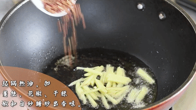 另起鍋熱油,加(jia)入(ru)姜絲(si)、花椒、干辣椒和一勺白砂(sha)糖炒(chao)出香味(wei)