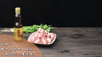 肥(fei)牛、粉絲、青瓜、西蘭花、芋(yu)絲、香(xiang)菜(cai)、小蔥、小米(mi)辣、大蒜、花生米(mi)