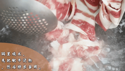 鍋(guo)里燒(shao)水,先把肥牛燙熟,然后撈(lao)出備用