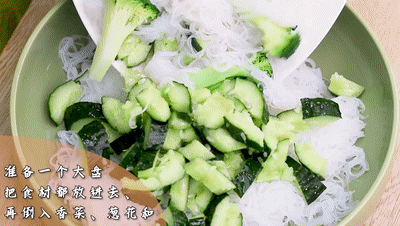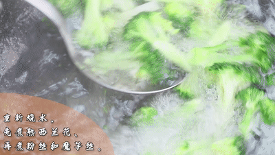 再重新燒(shao)水,先(xian)煮(zhu)熟西(xi)蘭(lan)花、再煮(zhu)粉絲和芋絲