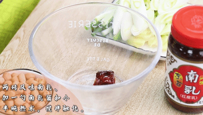 碗(wan)里放入(ru)兩(liang)磚東古風(feng)味(wei)南(nan)乳(ru)(ru)、加入(ru)一(yi)勺南(nan)乳(ru)(ru)醬和小半碗(wan)熱水,把南(nan)乳(ru)(ru)攪拌融化