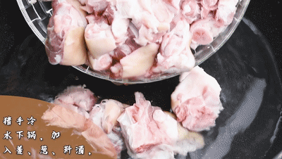 豬手(shou)冷水(shui)下鍋,加入姜、蔥、料(liao)酒,燒至水(shui)沸(fei),再(zai)煮兩(liang)分(fen)鐘撈出備用
