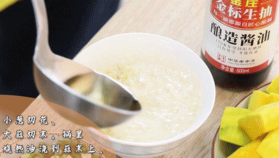 鍋(guo)里燒熱油澆到(dao)蒜末(mo)上,再加入一勺(shao)鹽和白糖,一勺(shao)東(dong)古金莊金標生抽,一勺(shao)東(dong)古蠔油攪拌均勻(yun)。