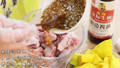 把蒜(suan)蓉汁倒(dao)入排骨中,加(jia)入一勺面粉。抓拌入味,腌制20分(fen)鐘。