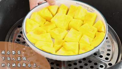 南(nan)瓜(gua)墊在(zai)下面入蒸鍋,排骨鋪(pu)在(zai)南(nan)瓜(gua)上。水開大火蒸20分鐘即可。