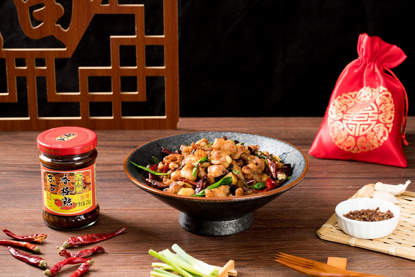 另起鍋(guo)燒油、加入(ru)大蒜蔥(cong)白(bai)爆(bao)香(xiang)(xiang)。加入(ru)一(yi)勺東(dong)古香(xiang)(xiang)格(ge)辣(la)炒出紅油。再加入(ru)干辣(la)椒和小米辣(la)、倒(dao)入(ru)雞丁翻炒均勻(yun)