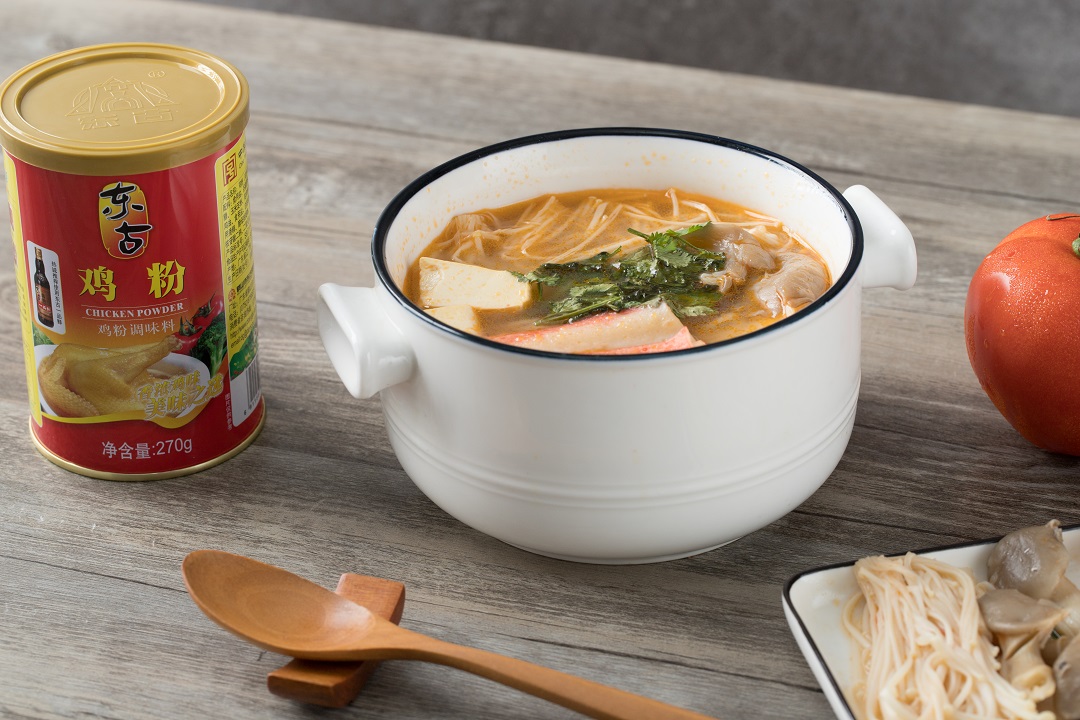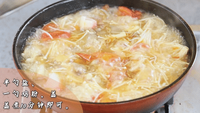 豆腐、蟹柳棒、秀珍菇、金針菇、番茄(qie)、蝦(xia)米、香菜、姜蒜
