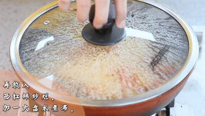 鍋里熱油,倒入姜蒜、蝦米炒出香味。再放入西紅(hong)柿炒爛,加入一大盤水煮沸