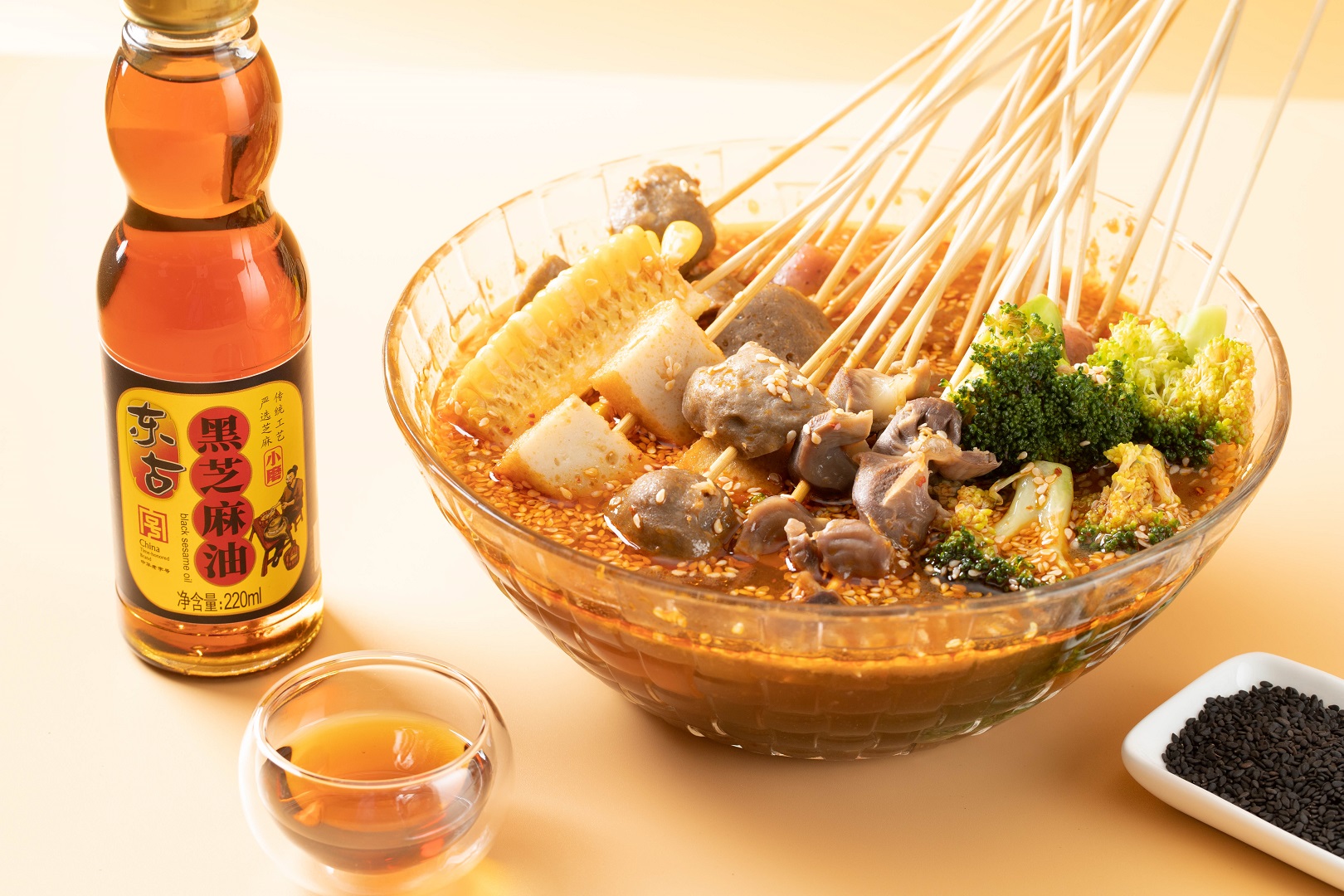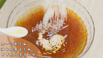 最后加入一(yi)勺東古(gu)黑(hei)芝麻油和(he)適量白芝麻,把串串放入浸泡入味即可