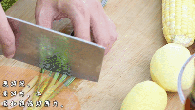 蔥切段、姜切片,土豆(dou)和蓮藕(ou)切薄片,西蘭(lan)花切中小塊、玉(yu)米對半(ban)折斷、再砍成四長段