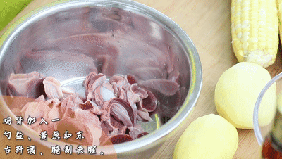 切(qie)好的雞腎放入盤里,加(jia)入一勺鹽、姜、蔥(cong)和東(dong)古料酒,腌制去腥(xing)