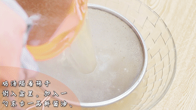 熬好的(de)雞(ji)湯撈(lao)出(chu)湯渣,再隔著篩子倒入盆里。加入一勺東(dong)(dong)古一品鮮(xian)醬油、一勺東(dong)(dong)古蠔油、一勺紅(hong)油辣(la)椒醬(喜(xi)歡吃辣(la)的(de)可以多放點(dian))攪拌均勻