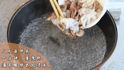 八爪魚焯水一分鐘(zhong),加入姜蔥(cong)料酒去腥(xing)