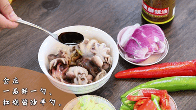 過涼水(shui)后的八爪魚加入(ru)一(yi)勺(shao)金(jin)莊一(yi)品(pin)鮮、半(ban)勺(shao)紅燒(shao)醬(jiang)油(you)、一(yi)勺(shao)白糖、白胡椒粉腌制3-4分鐘.