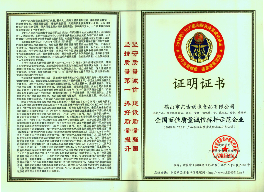 2018年315全國(guo)百佳質量(liang)誠信標(biao)桿示范企業
