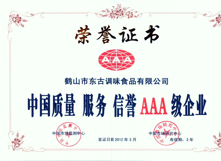 2012中國質量服務信譽(yu)AAA級企業榮譽(yu)證書