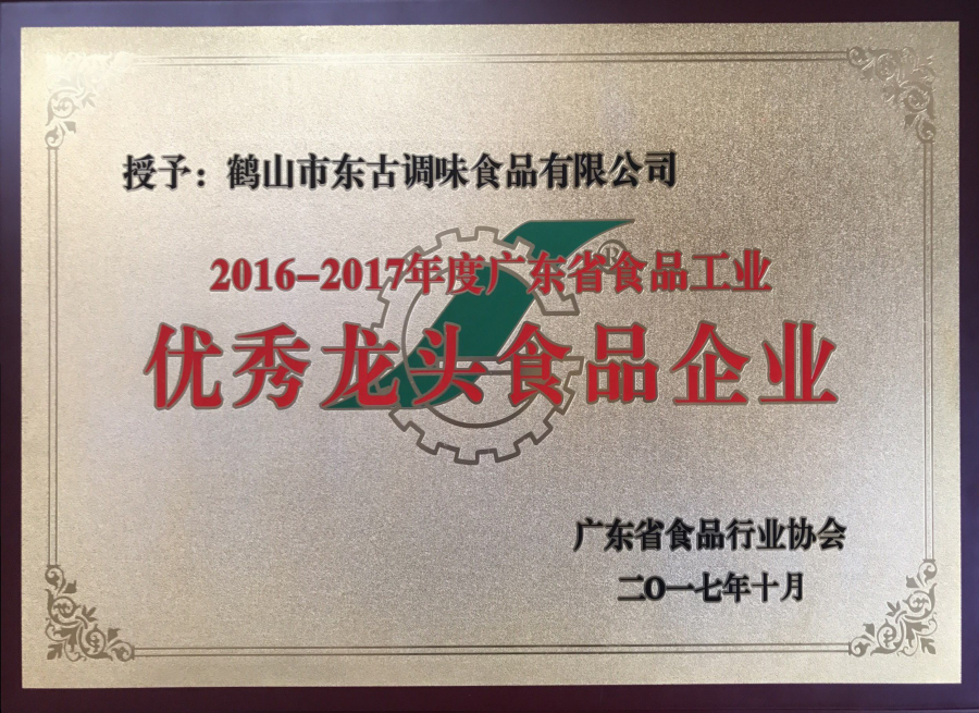 2016-2017年度廣東省食品(pin)(pin)工業(ye)優秀龍頭食品(pin)(pin)企業(ye)牌匾